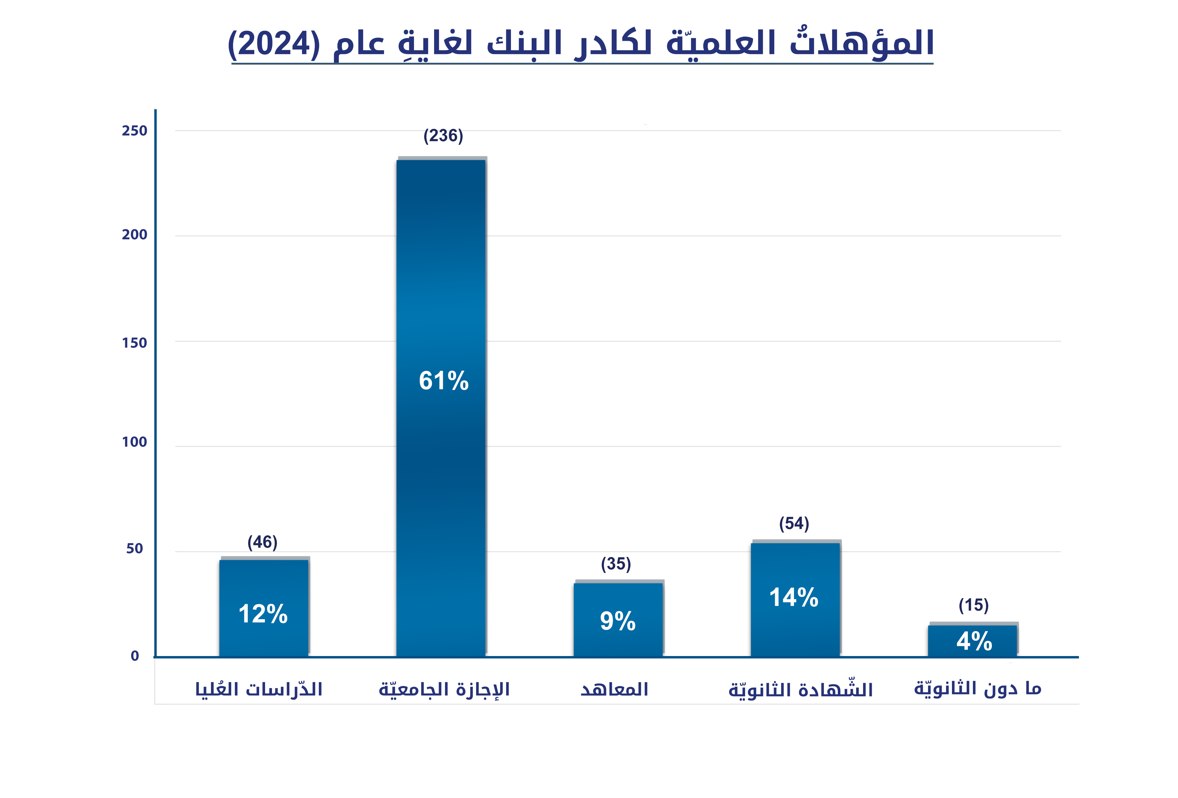 نُؤمن في بنك سورية والخليج بأن تطورنا ونجاحنا لن يتحقق إلا بتضافر جهود كادرٍ بشريٍ مؤهل ومحفَز ، لذا يقوم مجلس الإدارة والإدارة العليا في البنك بتقديم أوجه الدعم المختلفة وتخصيص الموارد المالية لتعزيز الجوانب المتعلقة بالتدريب والتأهيل لكافة موظفي البنك، وذلك حرصاً على الاستثمار الأمثل للكوادر البشرية. المؤهلات العلمية لكادرنا البشري