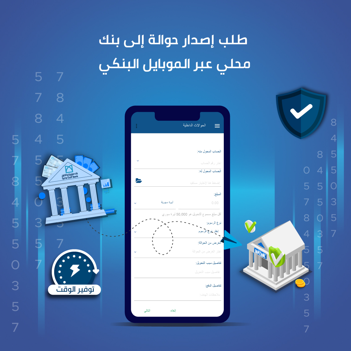تتيح هذه الخدمة إمكانية تقديم طلب إصدار حوالة إلى بنك آخر (ضمن سورية) من خلال تطبيق الموبايل البنكي أو الخدمة المصرفية عبر الإنترنت بدلاً من تقديمه في أحد فروع المصرف، حيث يستطيع العميل إنشاء طلب الحوالة من خلال تواجده في مكتبه أو منزله أو ..... الخ وذلك توفيراً له للوقت والجهد.