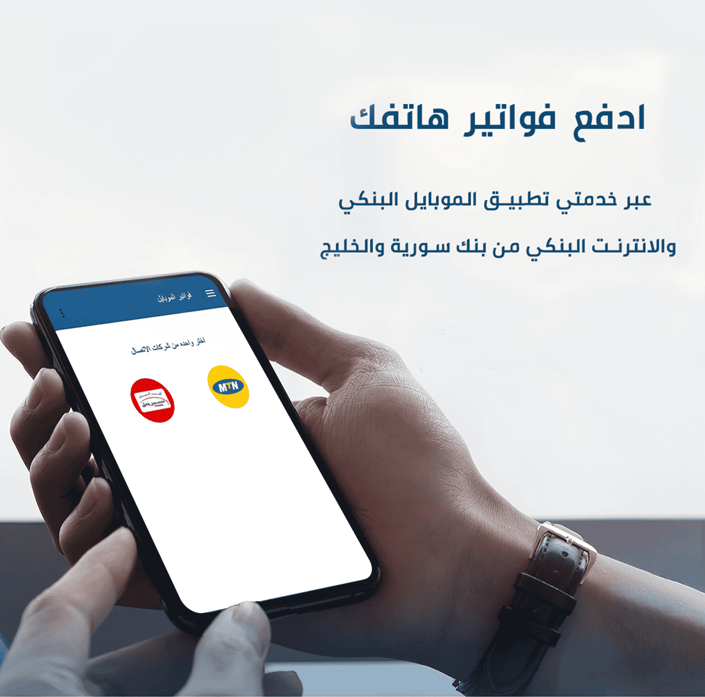 يتيح بنك سورية والخليج إمكانية دفع فواتير الموبايل عبر تطبيق الموبايل البنكي وخدمة الإنترنت البنكي، وذلك من خلال تسديد الفواتير للخطوط اللاحقة الدفع وتعبئة الرصيد للخطوط مسبقة الدفع لصالح شركتي (Syriatel) و (MTN).